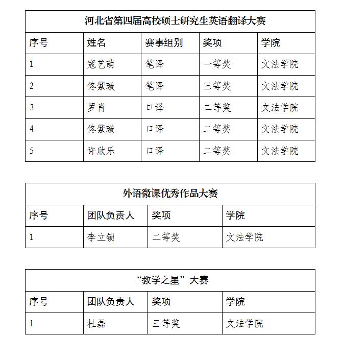 近日,华体网页版登录界面师生在多项国家级、省级外语类赛事中获佳绩。其中文法学院教师李立锁获2023年度“外语微课优秀作品”全国总决赛二等奖,杜磊获外研社“教学之星”大赛三等奖。在由河北省教育厅、河北省文史哲研究生教育指导委员会主办的河北省第四届高校硕士研究生英语翻译大赛决赛中,文法学院研究生获一等奖1项、二等奖3项、三等奖1项。