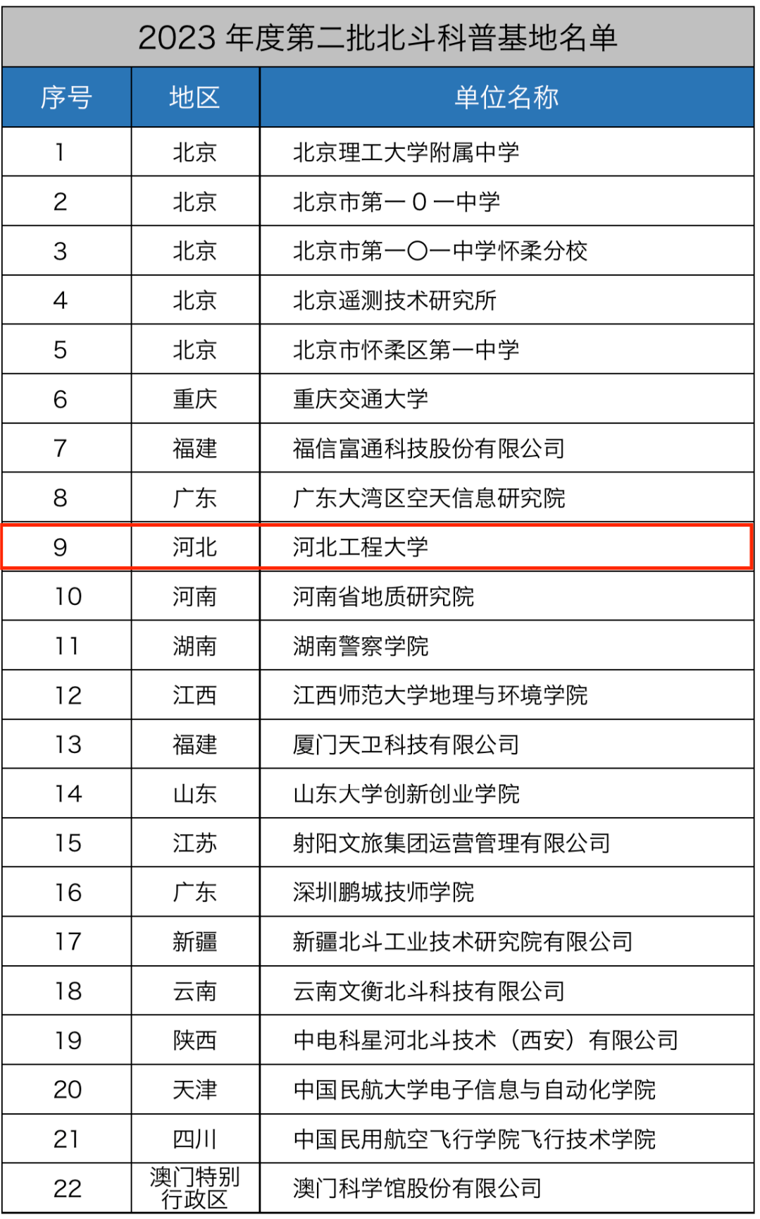 近日,中国卫星导航系统管理办公室学术交流中心公布了2023年第二批北斗科普基地名单,华体网页版登录界面成功入选。目前,华体网页版登录界面是北斗科普基地河北省唯一入选高校。