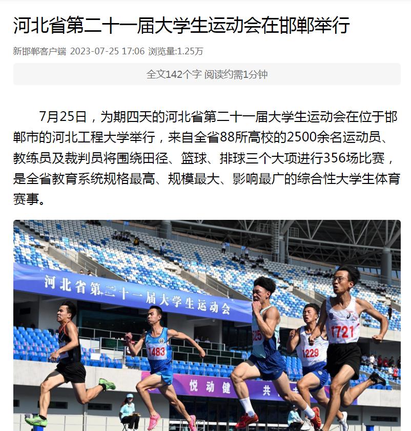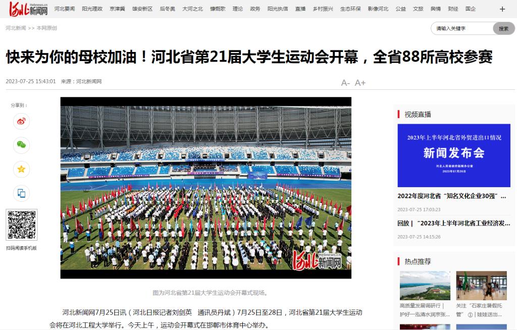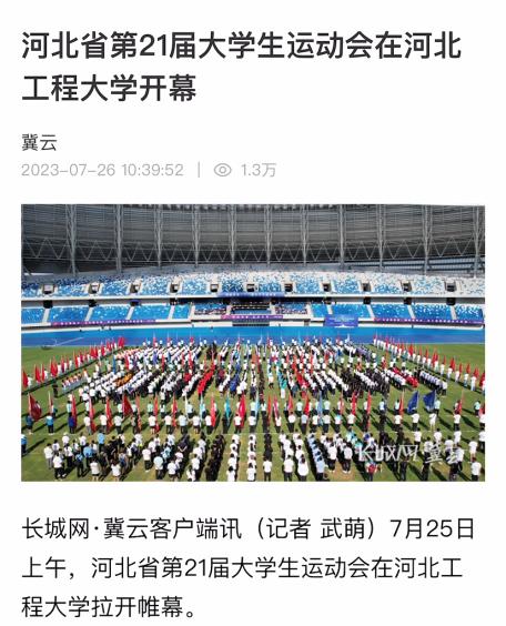7月25日至28日,河北省第21届大学生运动会在河北工程大学举行,25日上午在邯郸市体育中心举行了开幕式。中央广电总台国际在线、光明网、学习强国学习平台、河北日报、河北广播电视台、河北新闻网、长城网、中国教育在线、邯郸日报、邯郸晚报、邯郸广播电视台等多家媒体报道了开幕式及比赛情况。