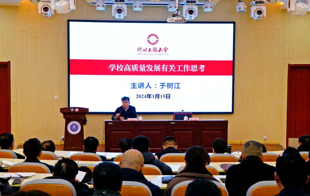 校党委书记于树江以“学校高质量发展有关工作思考”为题作首场报告。他围绕深刻领会教育强国建设的重大战略意义、贯彻落实2024年全国教育工作会议和2023年省属骨干高校座谈会精神,从行业特色院校发展、工科人才培养与改革、学位点建设与研究生培养、学科专业建设等方面,阐述了学校自身发展现状、存在问题与高质量发展方向,并对学校学科专业建设、人才培养、科研服务、教师队伍建设、学校治理等方面提出了明确要求。