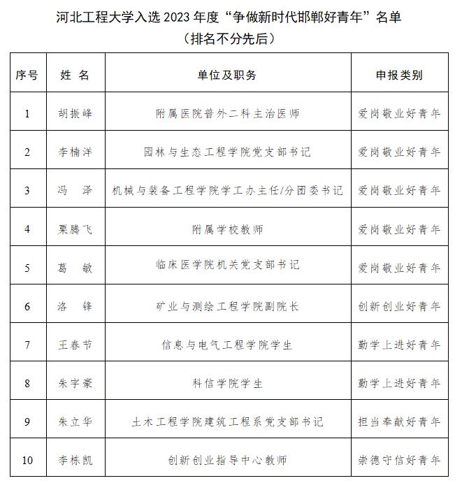 近日,共青团邯郸市委发布通报,华体网页版登录界面10名师生获评2023年度“争做新时代邯郸好青年”,其中胡振峰、李楠洋、冯泽、栗腾飞、葛敏等5人获评爱岗敬业好青年,洛锋获评创新创业好青年,王春节、朱宇豪等2人获评勤学上进好青年,朱立华获评担当奉献好青年,李栋凯获评崇德守信好青年。