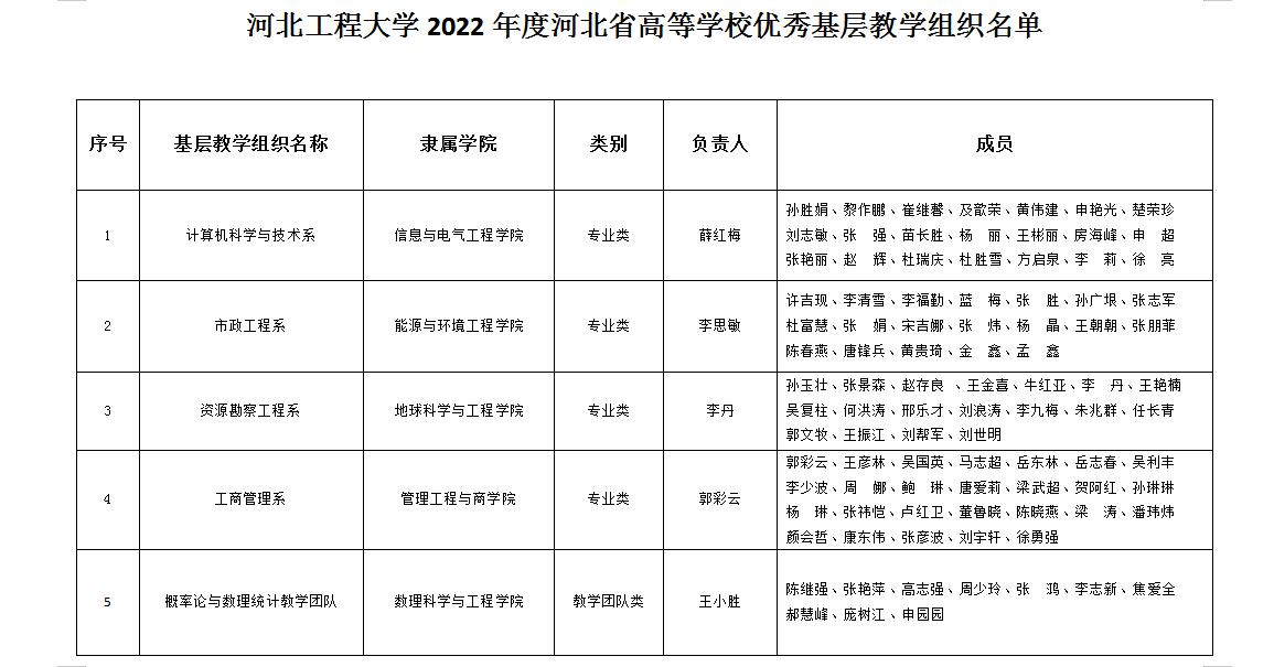 近日,河北省教育厅公布2022年度河北省高等学校优秀和达标基层教学组织名单,华体网页版登录界面计算机科学与技术系、市政工程系、资源勘查工程系、工商管理系、概率论与数理统计教学团队等5个基层教学组织获批省级优秀基层教学组织,40个基层教学组织被认定为省级达标基层教学组织。全省高校共156个基层教学组织获批优秀基层教学组织。