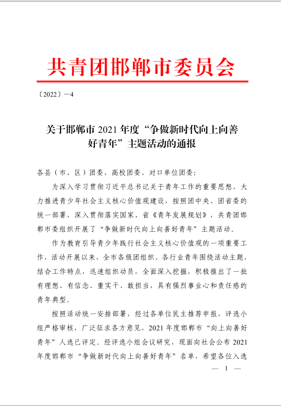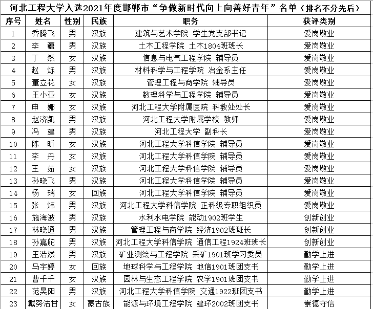 近日,共青团邯郸市委员会发布《华体(中国)邯郸市2021年度“争做新时代向上向善好青年“主题活动的通报》,华体网页版登录界面23名师生入选2021年度邯郸市“争做新时代向上向善好青年”名单,乔腾飞等15人获评“爱岗敬业好青年”、施海波等3人获评“创新创业好青年”、王浩然等4人获评“勤学上进好青年”、戴努沽甘获评“崇德守信好青年”。
