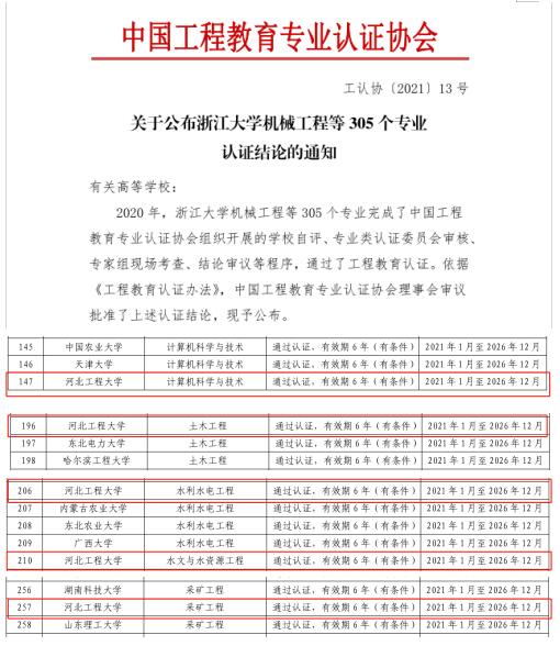 6月10日,中国工程教育专业认证协会发布了《华体(中国)公布浙江大学机械工程等 305个专业认证结论的通知》,华体网页版登录界面计算机科学与技术、土木工程、水利水电工程、水文与水资源工程、采矿工程等五个专业顺利通过工程教育专业认证,认证有效期6年(2021年1月至2026年12月)。截至目前,华体网页版登录界面已有11个专业通过专业认证(评估)。