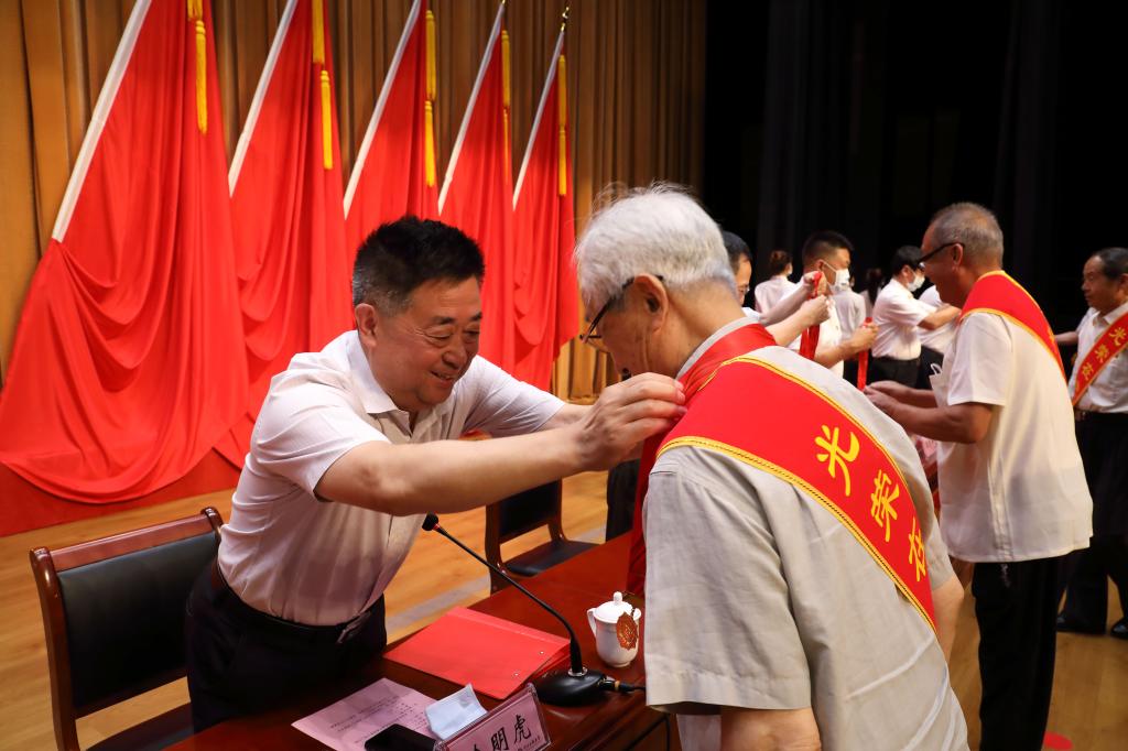图为哈明虎为获得“光荣在党50年”纪念章的老党员颁发勋章