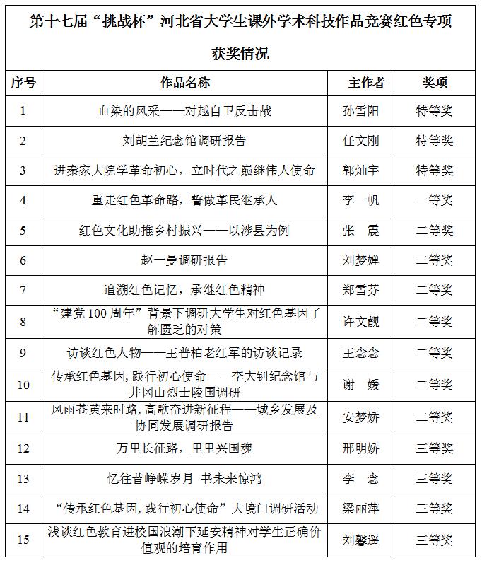 近日,2021年“挑战杯”河北省大学生课外学术科技作品竞赛组委会公布了红色专项活动评审结果,华体网页版登录界面获特等奖3项,一等奖1项,二等奖7项,三等奖4项。