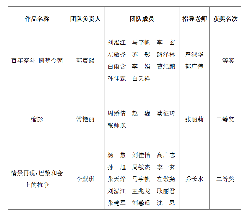 近日, 河北省教育厅公布“我心中的思政课”——第五届河北省高校大学生微电影展示活动获奖结果,华体网页版登录界面马克思主义学院指导推荐作品《百年奋斗 圆梦今朝》《缩影》《情景再现:巴黎和会上的抗争》获二等奖。