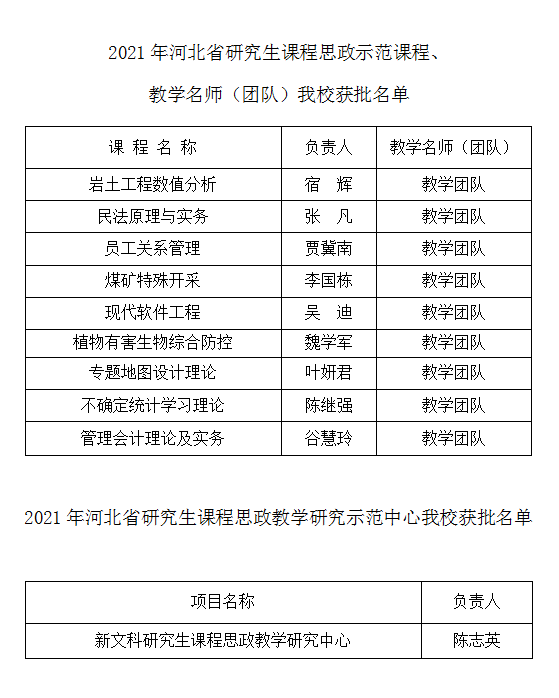 日前,河北省教育厅公布2021年省级研究生课程思政示范课程、教学名师(团队)和研究生教学研究示范中心名单,华体网页版登录界面岩土工程数值分析等9门课程获批河北省研究生课程思政示范课程、教学名师(团队),新文科研究生课程思政教学研究中心获批河北省研究生教学研究示范中心。