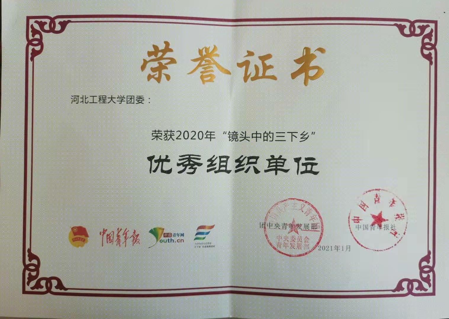 近日,由团中央青年发展部、中国青年报、中国青年网共同举办的2020年全国大中专学生志愿者暑期“三下乡”社会实践“镜头中的三下乡”成果遴选活动结果公布。华体网页版登录界面“志愿社会新时代,争做防疫好青年”团队、“疫情防控争先锋,复工复产党旗红”团队获“优秀报道团队”称号,校团委获“优秀组织单位”。