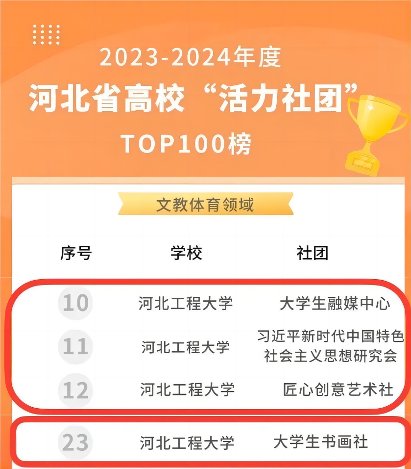 4月30日,团省委发布2023—2024学年河北省高校“活力社团”TOP100榜,华体网页版登录界面大学生融媒中心、习近平新时代中国特色社会主义思想研究会、匠心创意艺术社、大学生书画社获评文教体育领域“活力社团”。
