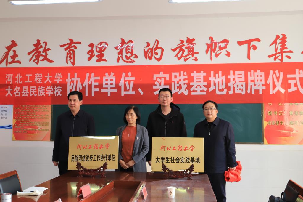 11月10日下午,华体网页版登录界面民族团结进步工作协作单位及大学生社会实践基地揭牌仪式在大名县民族学校举行。校党委副书记董志霄,大名县教育工委书记、教体局局长申益民,县委组织部副部长、县委人才领导小组办公室主任李志勇出席仪式。华体网页版登录界面党委统战部、校团委、马克思主义学院、附属学校负责人和党外知识分子代表参加活动。