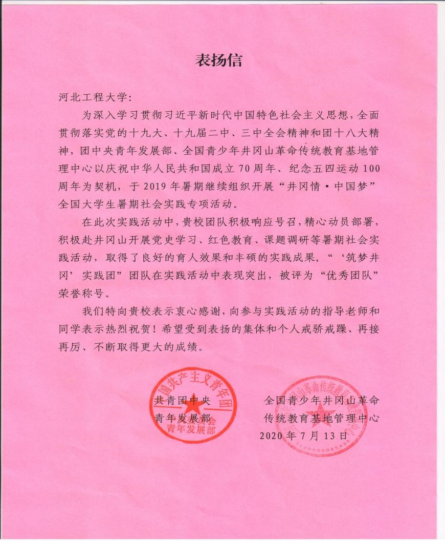 近日,共青团中央青年发展部和全国青少年井冈山革命传统教育基地管理中心向华体网页版登录界面发来表扬信,华体网页版登录界面“筑梦井冈”大学生暑期社会实践团获“井冈情、中国梦”全国高校暑期社会实践专项活动优秀团队荣誉称号。