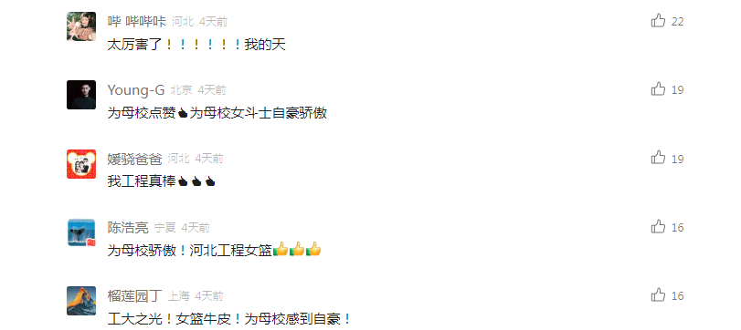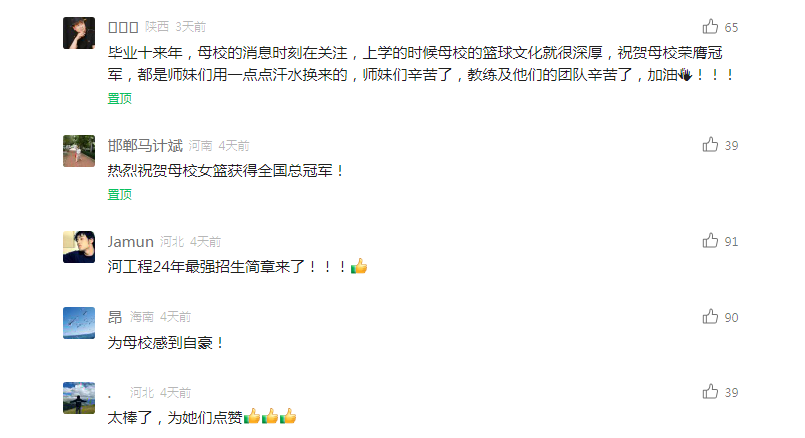 女篮夺冠后,校友们也纷纷在网上为母校送上祝福,“热烈祝贺母校女篮获得全国总冠军!”“为母校点赞,为女斗士自豪骄傲!”“毕业二十年,依然被母校的一举一动牵挂着,为母校感到由衷骄傲”。