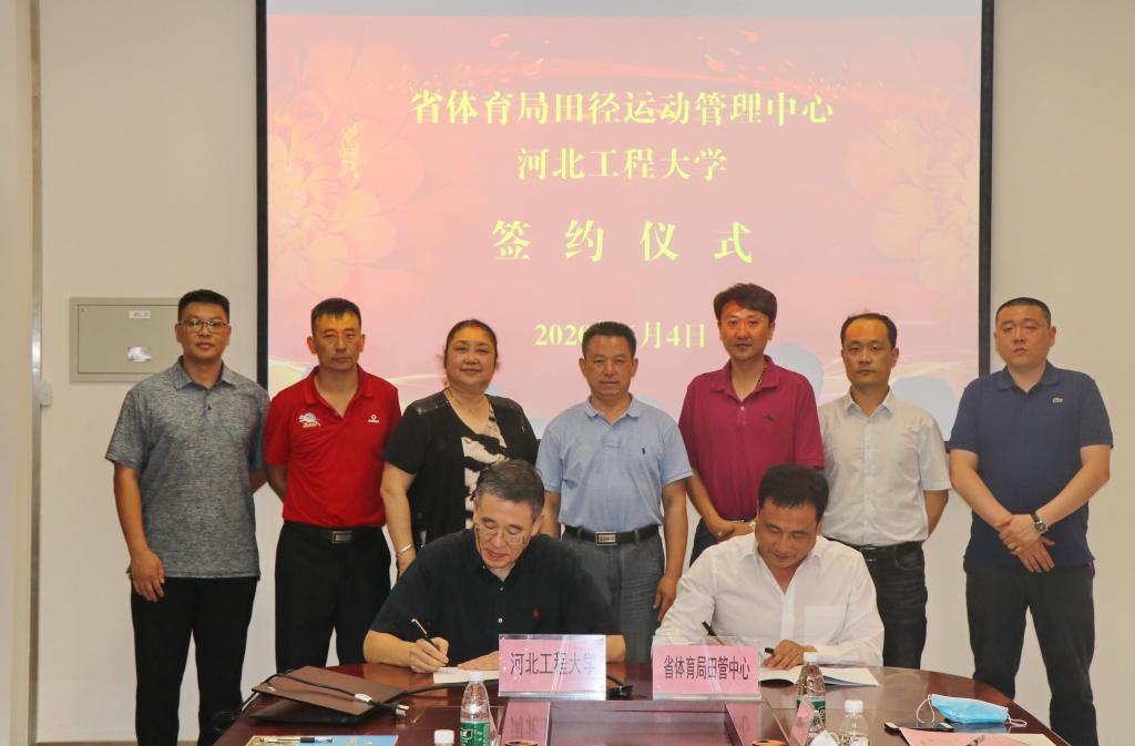 6月4日下午,河北工程大学与河北省体育局田径运动管理中心联办高水平运动队战略合作协议(2020—2025)签约仪式在行政服务中心351会议室举行。校党委常委、副校长贾东水,省田管中心主任刘晓马代表双方签订合作协议。华体网页版登录界面体育与健康工程学院相关负责人参加活动。