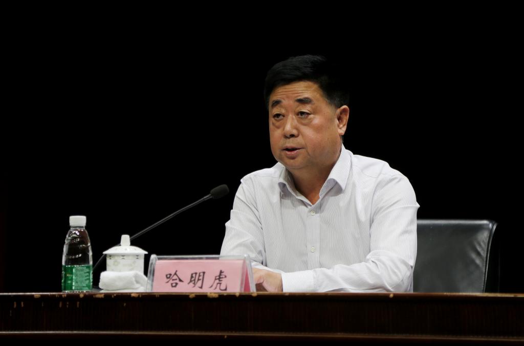 图为校党委书记哈明虎代表学校领导班子作表态发言