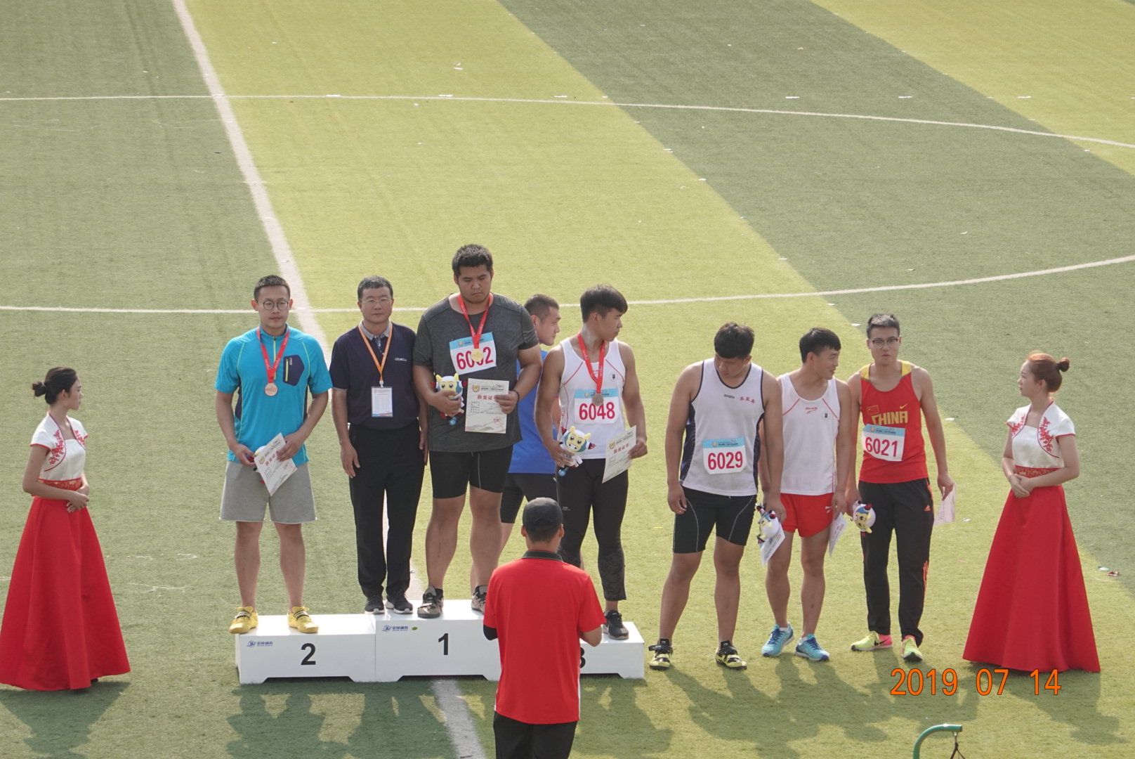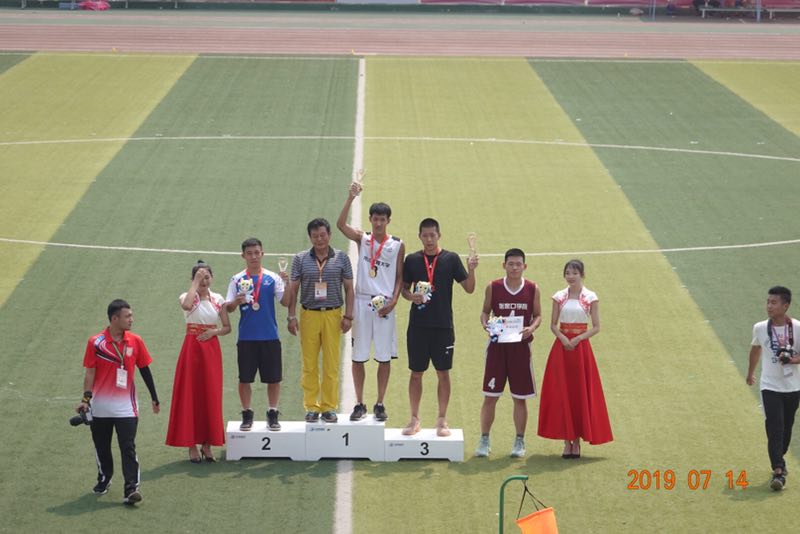 图为男子丁组铅球颁奖现场