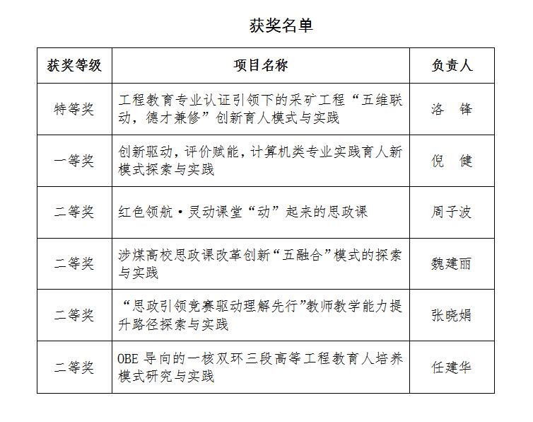 近日,中国煤炭教育协会公布2024年全国煤炭行业高等教育类(本科)教学成果奖获奖项目名单,华体网页版登录界面共有6项成果获奖,其中特等奖1项、一等奖1项、二等奖4项,这是华体网页版登录界面首次获评该奖项的特等奖。