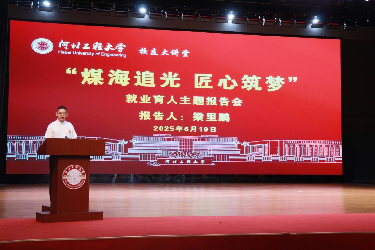6月19日下午,全国技术能手、全国五一劳动奖章获得者、全国劳动模范,华体网页版登录界面2009届电气工程及自动化专业毕业生梁里鹏返校做客校友大讲堂,为师生代表作“煤海追光匠心筑梦”就业育人主题报告。