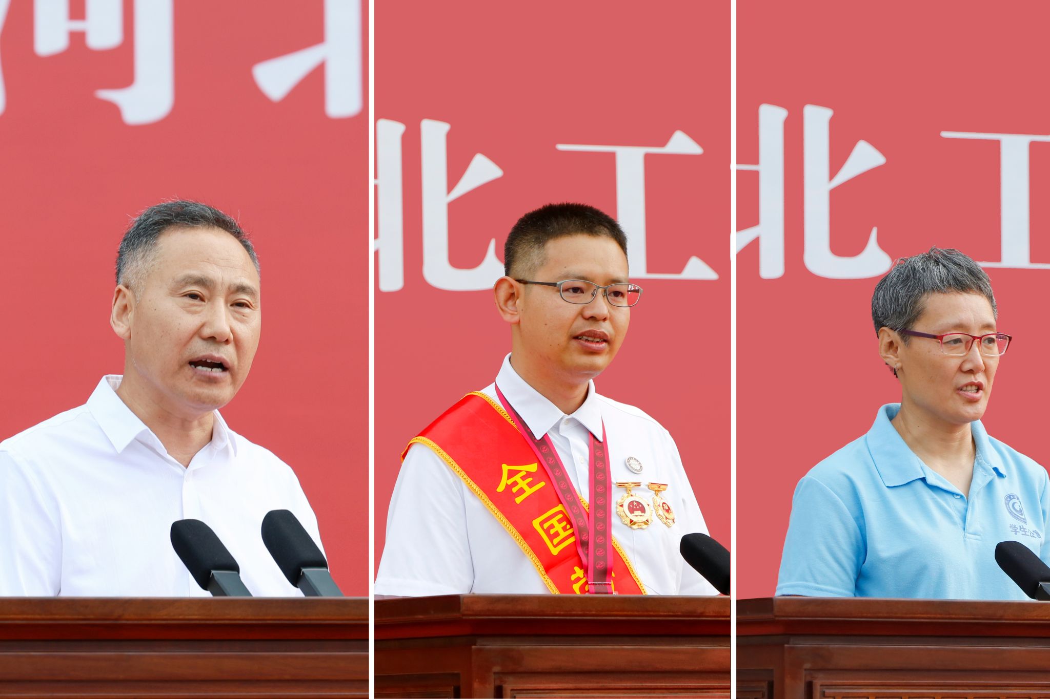 图为教师代表邢振国(左一)、校友代表梁里鹏(中)、工勤人员代表尹晓红(右一)发言