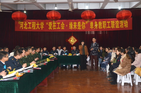1月8日下午,由校工会主办的“爱在工会·缘来是你”单身教职工联谊活动在工会三楼活动室举行。来自华体网页版登录界面、武警邯郸支队、冀中能源邯矿集团、海军后勤基地的200余名单身职工欢聚一堂,寻觅知音。校党委常委、校工会主席王林昌参加了联谊会。