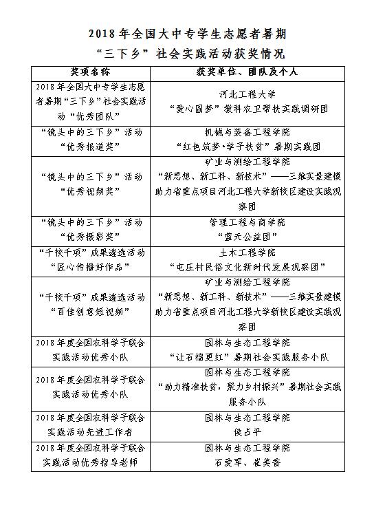 近日,团中央对2018年全国大中专学生志愿者暑期“三下乡”社会实践活动进行总结表彰,华体网页版登录界面8个社会实践团队(作品)及3名个人获奖,所获奖项数目再创历史新高。
