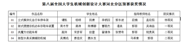 4月20日至22日,第八届全国大学生机械创新设计大赛河北分区预赛在石家庄铁道大学举行。华体网页版登录界面4件参赛作品获特等奖1项、一等奖1项、二等奖2项。特等奖作品《立式模块化自行车停车架》被推荐参加全国总决赛。