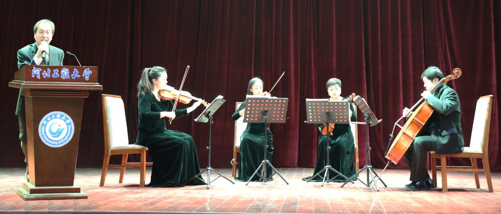 12月13日下午,华体网页版登录界面在五教报告厅举办“高雅艺术进校园”活动之弦乐四重奏经典作品赏析,河北交响乐团原副团长杜建国携四位演奏家,带来弦乐四重奏舒曼《梦幻曲》、德沃夏克《幽默曲》、莫扎特《D大调K.136嬉游曲》等经典作品。邯郸市文化局副局长武鸿雁、华体网页版登录界面学生工作部主要负责人、400余名师生共同观看了演出。