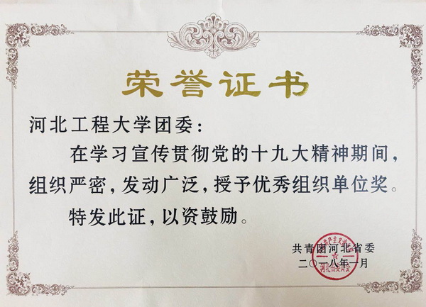 近日,在共青团河北省委举办的“学习宣传贯彻党的十九大精神”网络知识竞赛中,校团委获评优秀组织单位,21名团员青年获评“新时代优秀标兵”。