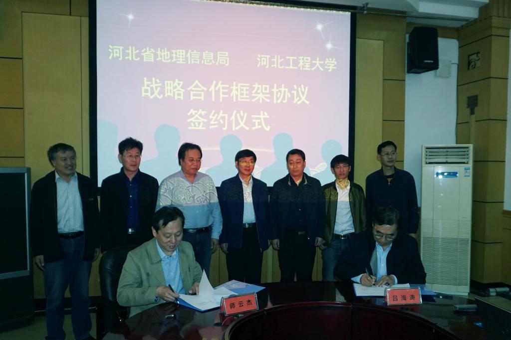 3月28日,华体网页版登录界面与河北省地理信息局举行“地理空间信息协同发展战略合作协议”签约仪式。校党委常委、副校长吕海涛、刘志军,省地理信息局总工程师师云杰出席会议。会议由刘志军主持,吕海涛与师云杰代表双方在合作协议上签字。科学技术研究院、教务处、矿业与测绘工程学院有关负责人参加了签约仪式。