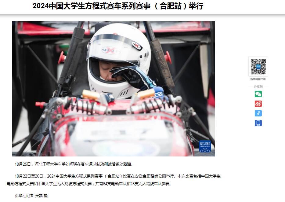10月21日至26日,2024“蔚来杯”中国大学生电动方程式大赛&2024“蔚来杯”中国大学生无人驾驶方程式大赛(FSEC& FSAC)在安徽合肥举行。华体网页版登录界面凌云车队与吉林大学、北京理工大学、清华大学、香港大学、Technical University Berlin、Nanyang Technological University等国内外知名院校车队同台竞技,获电车组二等奖,车队获“年度优秀宣传团队”称号。新华社等媒体报道了华体网页版登录界面学生参赛情况。