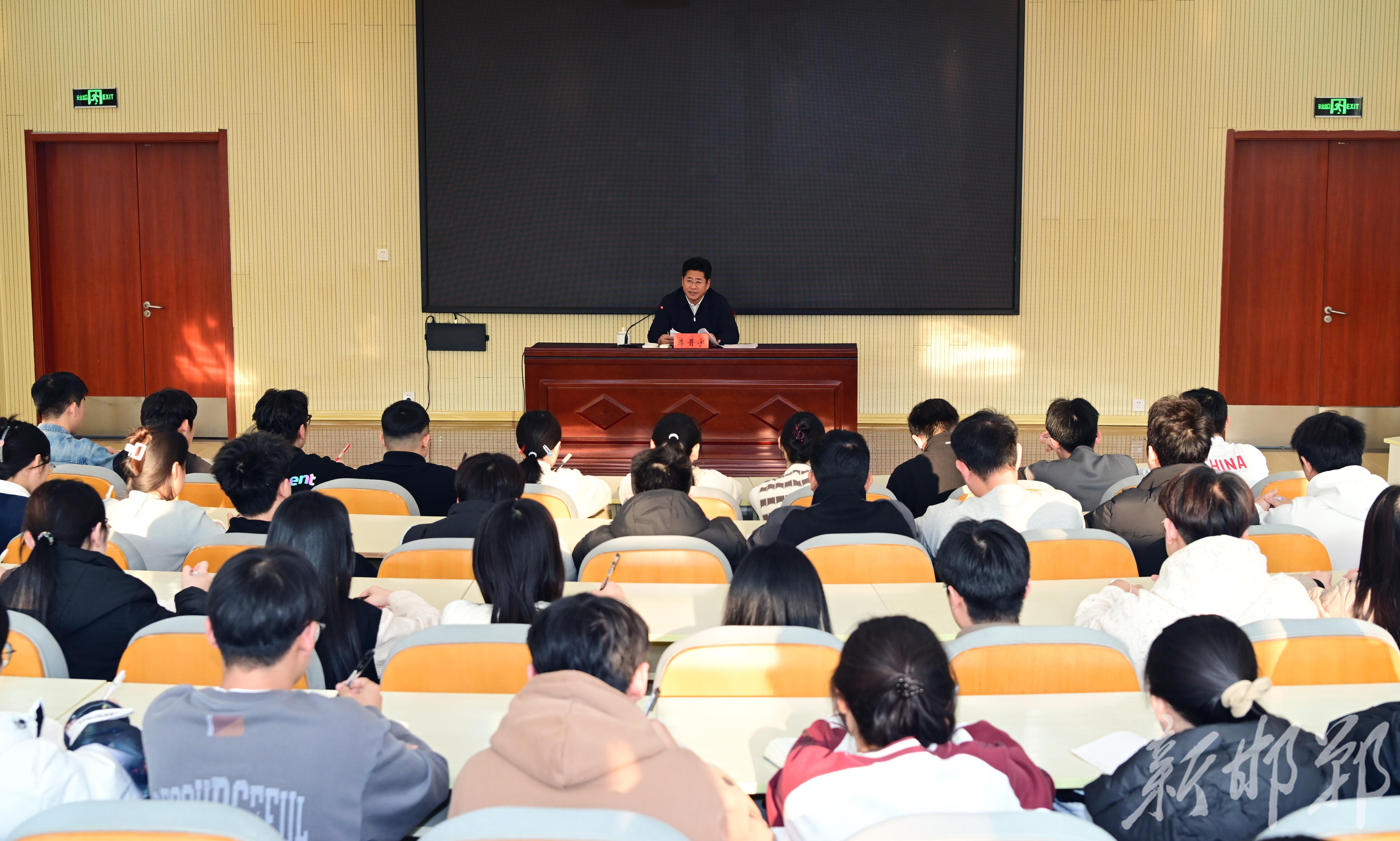 学校党委书记于树江,邯郸市领导杜树杰、张永新,学校领导王虎平、张金江、刘心、赵存良,学校管理工程与商学院、机械与装备工程学院、信息与电气工程学院本科生、研究生代表200余人参加学习。
