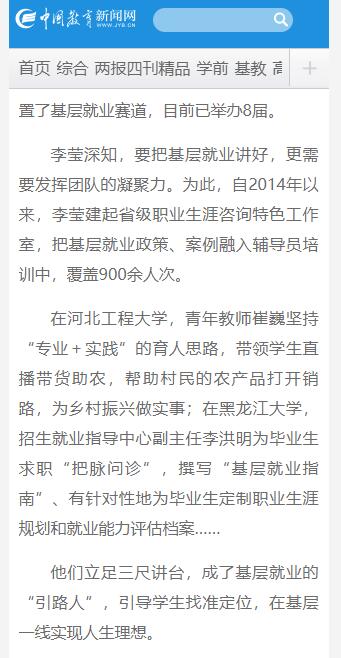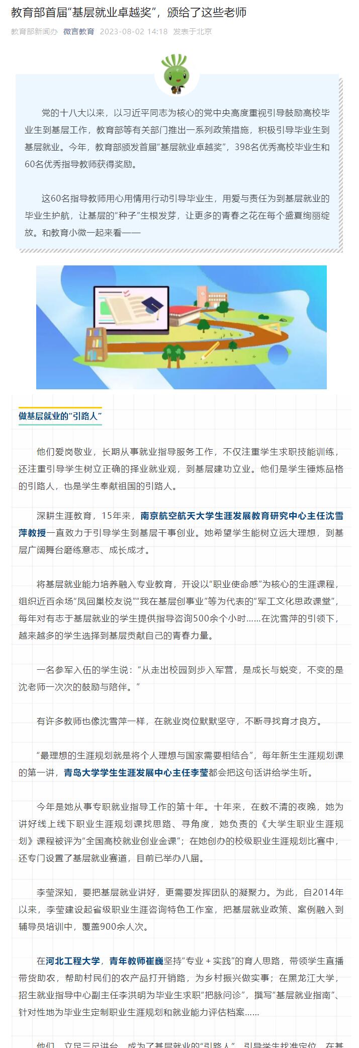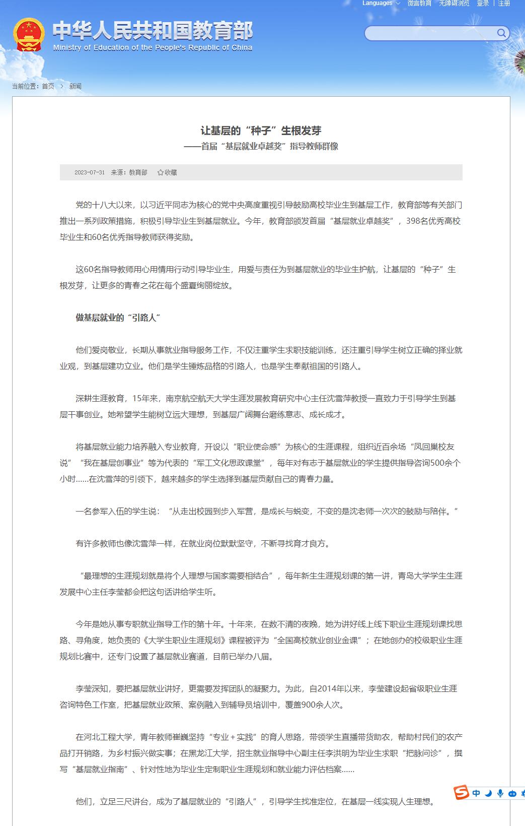 7月31日至8月2日,教育部官网、中国教育报头版等媒体以“让基层的‘种子’生根发芽——首届‘基层就业卓越奖’指导教师群像”为题报道首届基层就业卓越奖指导教师先进事迹。华体网页版登录界面获奖教师崔巍事迹名列其中。