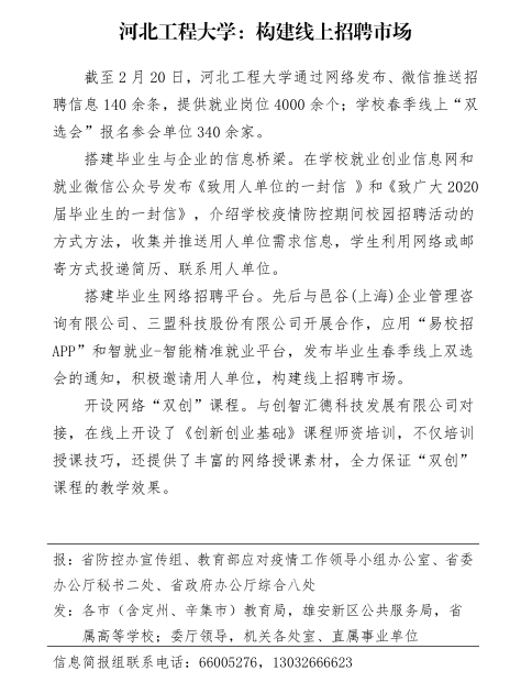 2月20日,《河北省教育厅新型冠状病毒感染肺炎疫情防控工作简报》以题“河北工程大学:构建线上招聘市场”刊发华体网页版登录界面就业服务工作,内容如下: