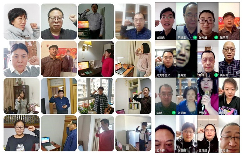 上午8:00,马克思主义学院全体教师伫立屏幕前,在院长严淑华的领誓下,举起右手,庄严宣誓:“我志愿成为一名人民教师,忠诚党的教育事业,遵守教育法律法规,履行教书育人职责,引领学生健康成长,做到有理想信念、有道德情操、有扎实学识、有仁爱之心,为教育发展、国家繁荣和民族振兴努力奋斗!”同一时间,不同地点,隔空相约,践行誓言。疫情拉开了人与人的距离,却让爱和温暖走进每一个心里,教师间情更深,同事间爱更浓、心更近。