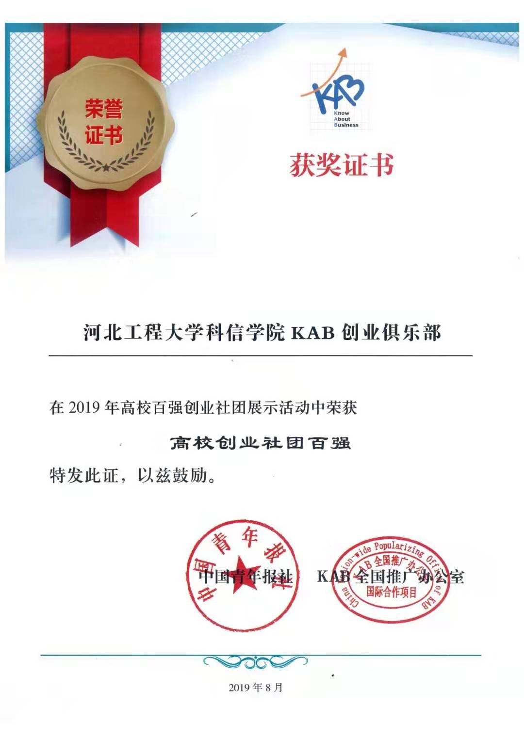 近日,在2019年高校百强创业社团展示活动中,华体网页版登录界面科信学院大学生KAB创业俱乐部荣获“高校创业社团百强”荣誉称号。这是继2018年4月科信学院获批全国大学生KAB创业教育基地、2019年5月获批大学生KAB创业俱乐部后的又一殊荣。