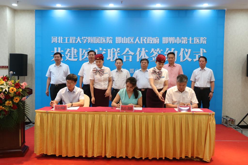 6月11日,华体网页版登录界面附属医院与邯山区政府、邯郸市第七医院共建医疗联合体三方签约仪式在金龙大酒店举行。校党委副书记、主持行政工作的副校长练继建,校党委常委、副校长刘志军,邯山区委书记靳禄兵,区长张才芳,副区长尹艳玲出席仪式。刘志军、尹艳玲及市第七医院院长李学民共同签署了三方共建医疗联合体合约。