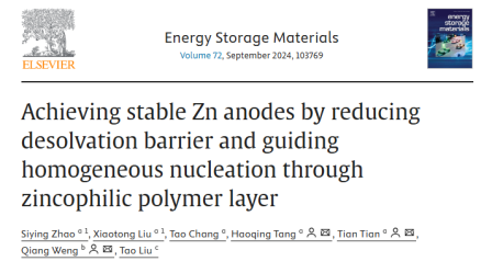 近日,华体网页版登录界面材料科学与工程学院唐好庆教授团队在《Energy Storage Materials》上发表了题为“Achieving Stable Zn Anodes by Reducing Desolvation Barrier and Guiding Homogeneous Nucleation through Zincophilic Polymer Layer”的研究论文,为实现稳定的水系锌离子电池提供了科学基础。材料科学与工程学院化学工程专业2022级硕士研究生赵思莹为论文第一作者,唐好庆教授为论文第一通讯作者,河北工程大学为论文第一完成单位。