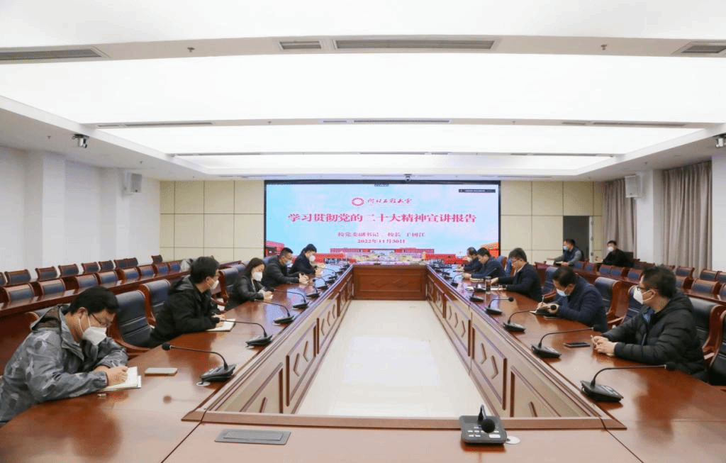 于树江在报告中强调,党的二十大报告主题鲜明、思想深邃、内涵丰富、博大精深,通篇闪耀着马克思主义真理光芒,是奋进新征程、续写新辉煌的政治宣言和行动指南。我们必须把握好、坚持好、运用好贯穿其中的立场观点方法,坚持和加强党的全面领导,落实立德树人根本任务,努力培养堪当民族复兴重任的栋梁之材,把工程特色鲜明的高水平现代大学建设融入新征程的时代洪流,以优异的工作成绩书写学校高质量发展新篇章。