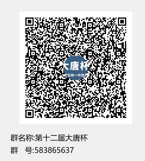 请参赛同学扫码加入QQ群:583865637,申请加群时注明“班级+姓名”。有关赛事的相关通知会陆续在群内发布,详细介绍及竞赛规则说明详见官(https://dtcup.dtxiaotangren.com/)。