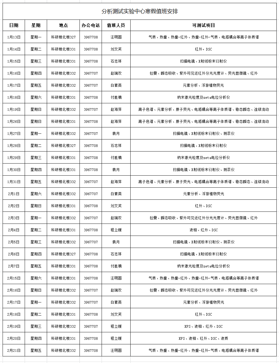 每日测试项目安排见下表,师生可根据科研进度,结合中心值班安排,提前2天做好假期测试预约,预约电话0310-3967707/3967708。